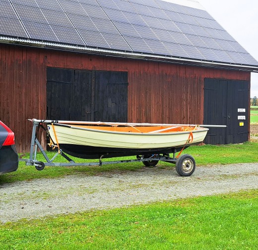 I våras skrev jag om att jag ville ha en liten segeleka när jag i framtiden bor vid Sommen, och jag fick bidrag till det i födelsedagspresent i våras. Igår hämtade jag mitt skepp – en Askeladden 14 – som det var höstrea på i Jakobsberg och som nu står i lidret efter en långsam färd på småvägar hem med 30-släpet som ingick i priset. Den kommer snart att få plats i garaget på Gunnarsbo i väntan på våren och min båtplats vid Asby brygga. Så det går framåt, ett steg i taget!